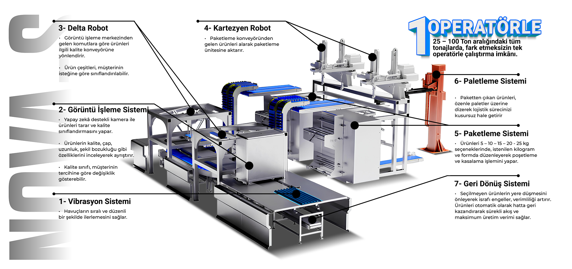 • Yapay zekâ destekli kamera ile ürünleri tarar ve kalite sınıflandırmasını yapar.